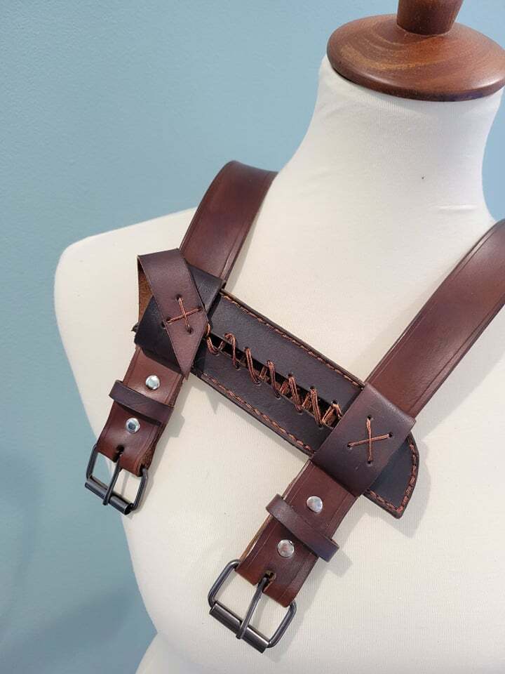 This bundle gets you a printable digital pdf pattern of Caleb's book holsters, Imogen's harness, and Imogen's Knife sheath!